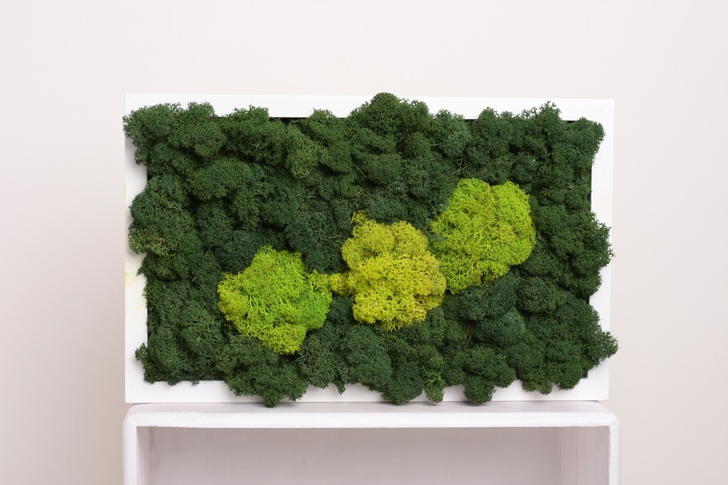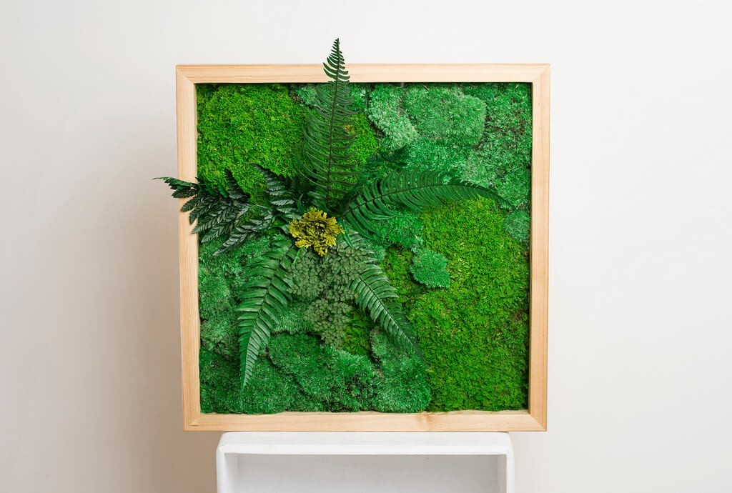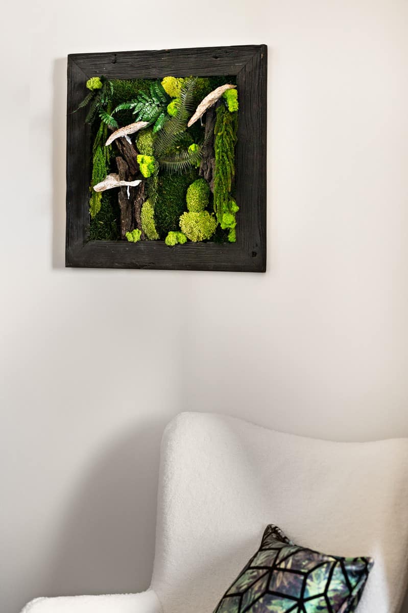 Co powiesz na panel ścienny z mchu chrobotka, mchu renifreowego i roślin stabilizowanych. Taka dekoracja nie wymaga pielęgnacji, ani podlewania! Zobacz nasze realizacje.